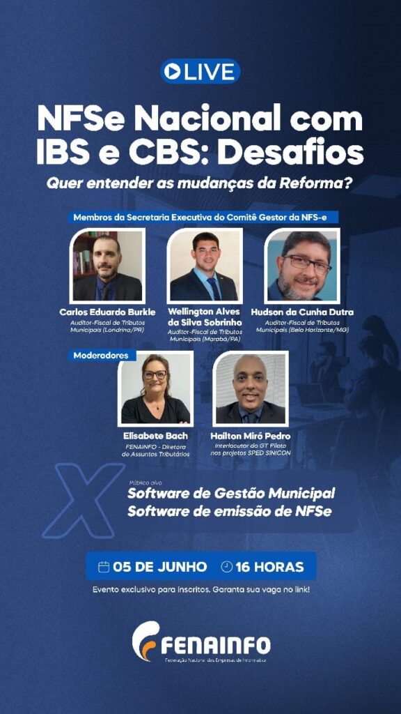 A COLLABTECH, por meio de sua federação nacional, a FENAINFO, convida todas as empresas associadas a participarem da live “Reforma Tributária | NFSe Nacional com IBS e CBS: Desafios e Caminhos da Implementação”. O tema é de extrema relevância para o setor de tecnologia e serviços, especialmente diante da adoção obrigatória da NFSe Nacional integrada ao IBS e à CBS a partir de 2026. Esta é uma oportunidade estratégica para compreender os impactos da Reforma Tributária sobre a emissão de documentos fiscais de serviços e se antecipar às exigências legais e técnicas que afetarão diretamente sistemas, operações e modelos de negócio.